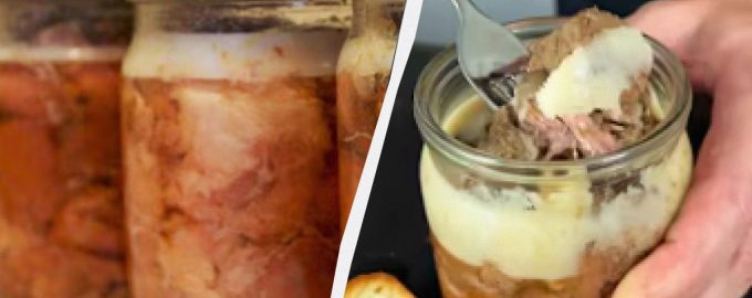 Rör aldrig om köttet med en sked under tillagningsprocessen. Efter två timmar öppnar du locket och trycker ner köttet så att fettet stiger upp och ligger ovanför köttets nivå. Sätt på locket igen och koka i ytterligare en timme, lägg sedan i lagerbladet. Sätt på locket igen och låt koka i en och en halv till två timmar. Kontrollera om fläskbitarna faller isär när du trycker på dem. Om de gör det är grytan klar. Den kan hällas upp i steriliserade burkar och ställas undan för förvaring.