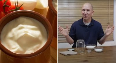 „Ta nu en ren trasa och täck över burken med den. Fäst den med ett gummiband, garn, rep eller något liknande för att förhindra att den glider av. Låt burken stå i rumstemperatur i 24 timmar. När blandningen har tjocknat tar du bort duken. Du kommer att märka att den är tjock på toppen och lite vattnig på botten – den är skiktad. Detta är helt normalt. Ta bara en stor sked och blanda allt tills det är jämnt. Överför det sedan till en behållare. Din tjocka hemgjorda gräddfil är klar“, säger Matt.