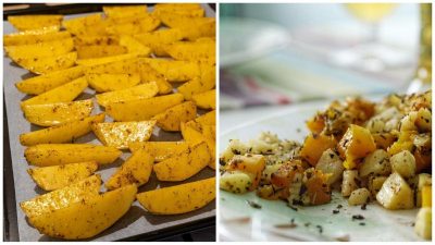 Ta försiktigt ut bakplåten ur ugnen och lägg potatisen i ett lager på plåten. Baka i 25-35 minuter, beroende på potatisens storlek. Efter 20 minuter öppnar du ugnen och vänder potatisen med en spatel.