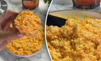 Häll först mjölken i en djup skål, tillsätt ägg, salt och smör. Blanda allt väl.