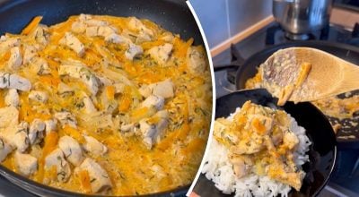 Rengör först kycklingfilén och skär den i små bitar. Lägg den i en stekpanna med smält smör. Medan köttet steks, skär lökarna i halva ringar och morötterna i strån.
